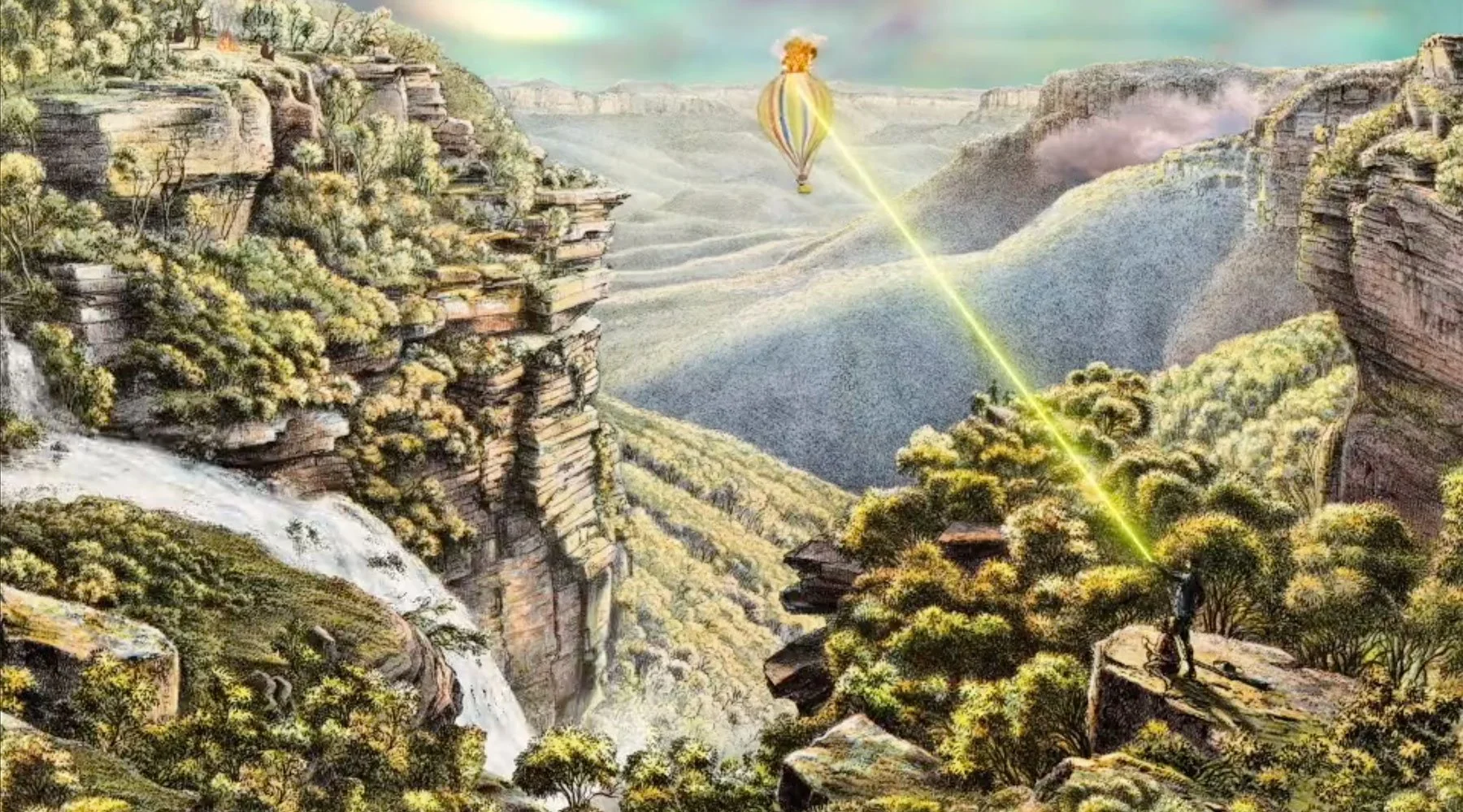 Penetrating the colonial canvas, Ross leaves us to watch a tableau of greed. The ultimate separation from nature: self-interest, lack of care, possession, ownership, mansions, silverware, violent festivities toasting over ‘their land’; blow flies, bees, celebratory fireworks over a bleak horizon; balloons, lavish curtains, fake advertisements for leaf blowers and perfume; native-non-native plants pollinating with themselves, flowers with the heads of colonists/aliens; security cameras, butterflies, superiority, willy-willies spitting out leather lounges, TVs, light bulbs, happy couple figurines, pianos, vases, paintings, oh my!